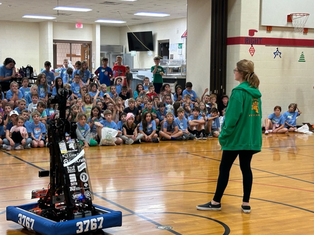 June 2023 – We shared our love for STEM at Traverse City’s Camp Invention, where over 100 elementary students enjoyed the antics of our robot, Cerberus, and heard all about what was involved in putting our bot together. Cerberus was quite a hit.