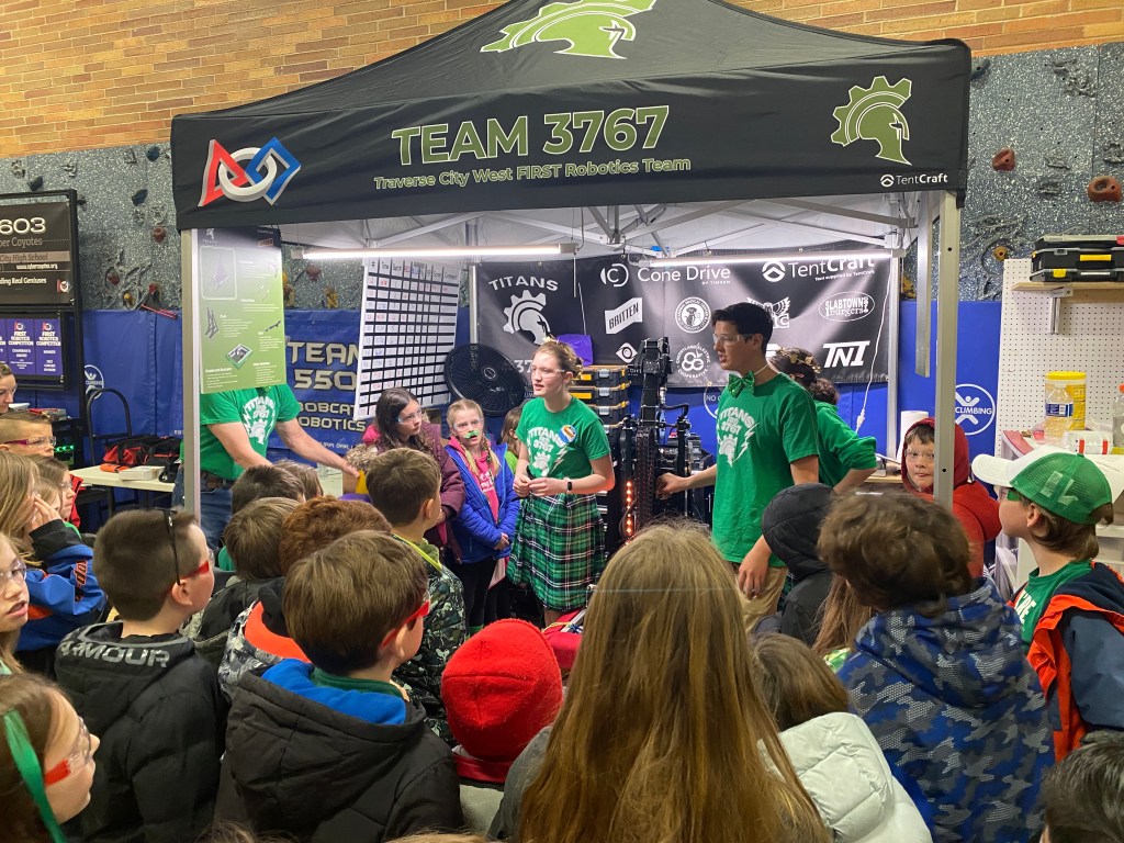 In March, the TC Titans co-hosted local elementary schools at our local FIRST FRC Competition in Traverse City. Members of our team toured the students through the pit area while our pit crew answered lots of great questions from the kids. We also led them in plenty of red alliance/blue alliance cheers as they watched the competition, teaching them all about Gracious Professionalism.
