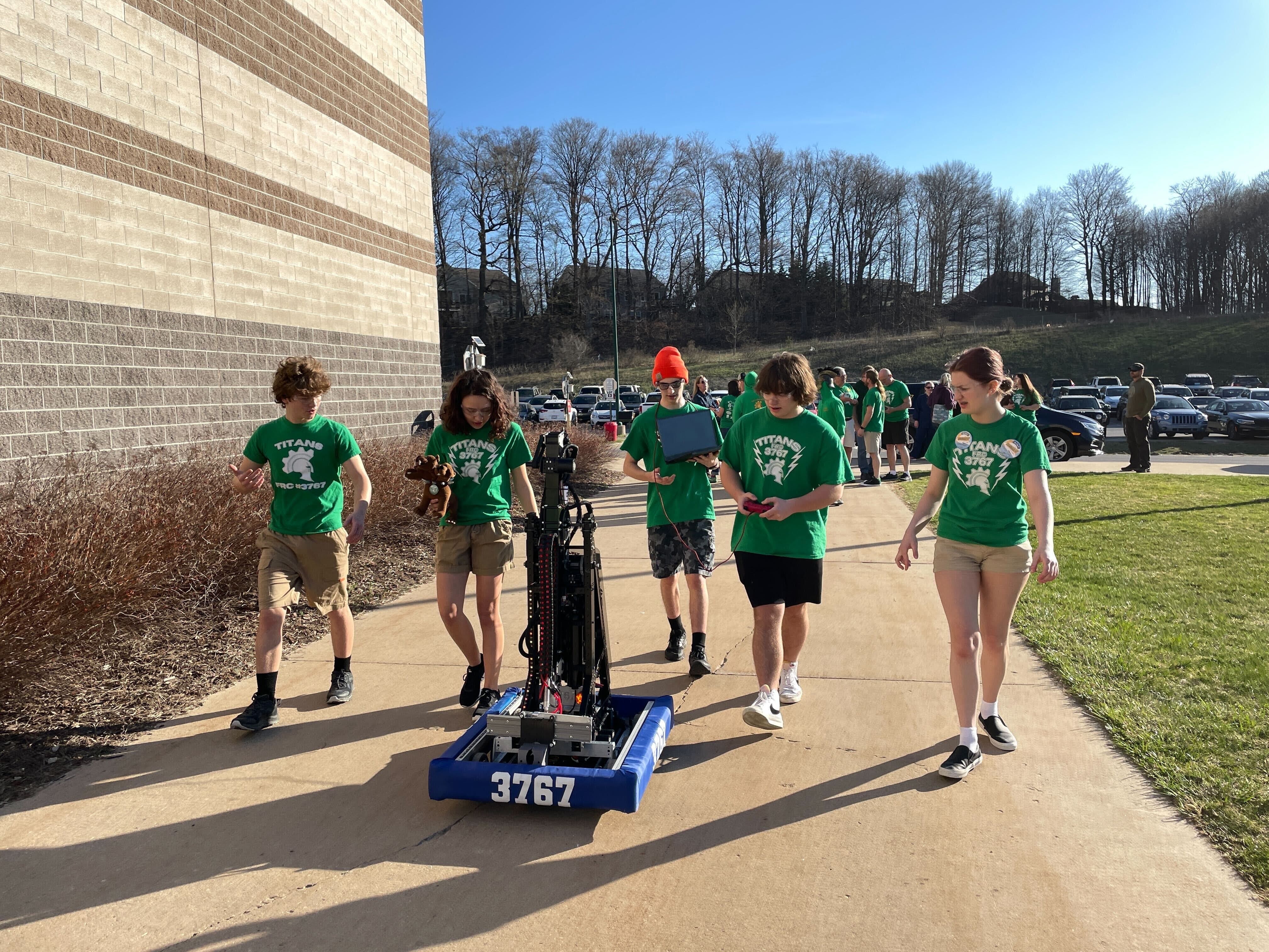 April 2023 – We showed off our robot, Cerberus, at our high school as it led the TC Titans out the door as part of our send-off to the World Championships in Texas. Many at the school had not seen our robot, nor its capabilities, prior.
