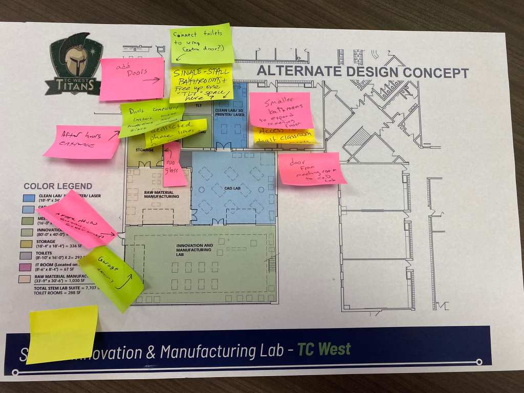 Also in May 2023, members of TC Titans engaged in the conversations surrounding the new Innovation and Manufacturing Center being added to our high school. In may we attended the school district’s discussion on the design concepts and provided feedback, a la post-it notes, on the layout of the space.