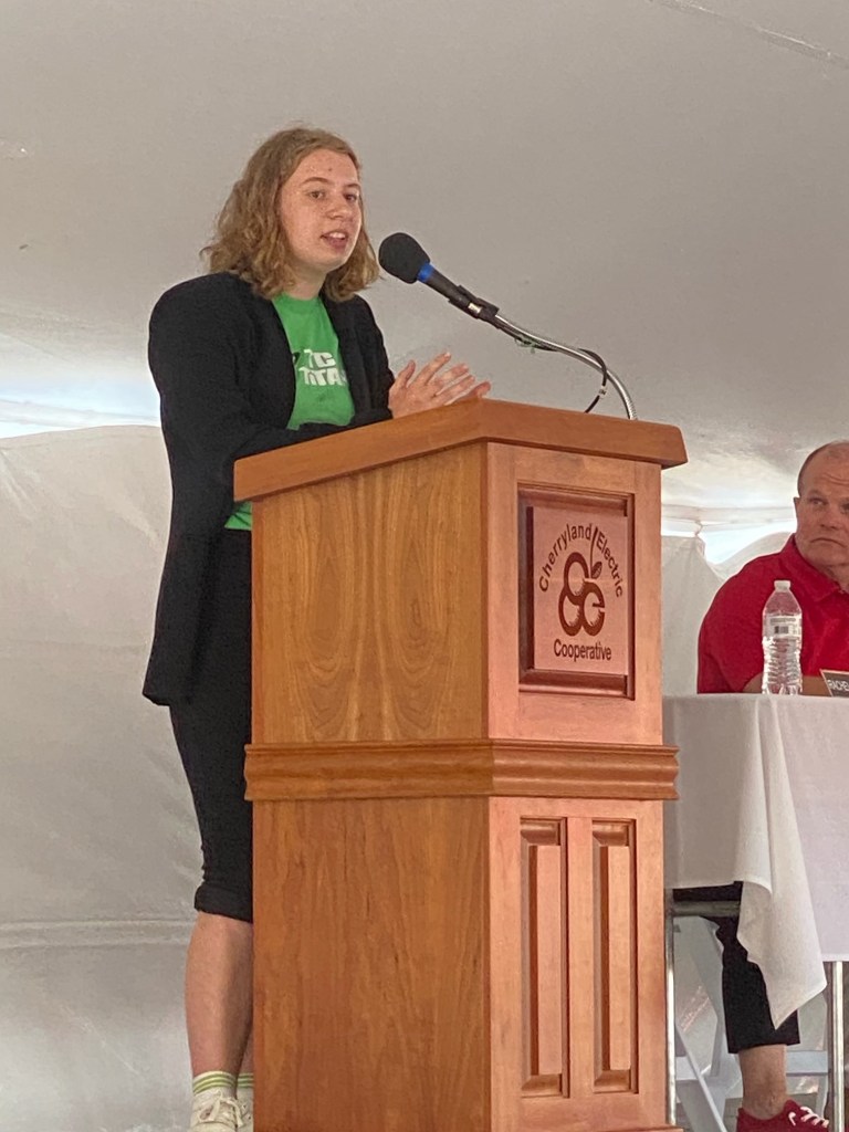 In June ’24 we were invited to speak at Cherryland Electric Cooperative’s Annual Meeting. Not only did we share our team’s story with Cherryland’s co-op members, but we showed off our Crescendo season robot, Saturn, too. Some team members and even our team flag got a lofty ride in one of Cherryland’s bucket trucks.